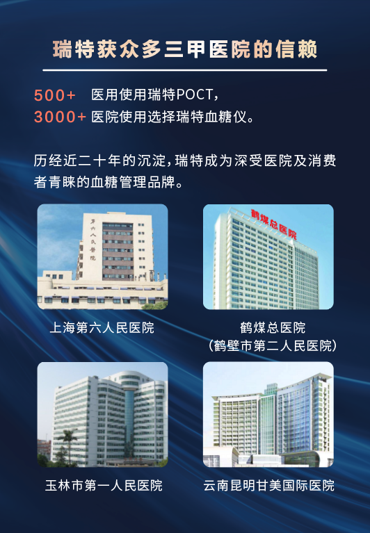 瑞特成功整合了先進(jìn)的醫(yī)療、化學(xué)、電子與精密制造技術(shù),獲得多項(xiàng)獨(dú)特的血糖檢測專利,采用黃金電極專利技術(shù),確保每一次血糖測量數(shù)據(jù)的準(zhǔn)確性。迄今為止,瑞特產(chǎn)品在全球已經(jīng)取得超過80個國家的權(quán)威認(rèn)證,產(chǎn)品銷售遍布全球100多個國家和地區(qū),瑞特血糖管理系統(tǒng)成功入駐500多家醫(yī)院,瑞特血糖儀產(chǎn)品供貨國內(nèi)3000多家醫(yī)院。