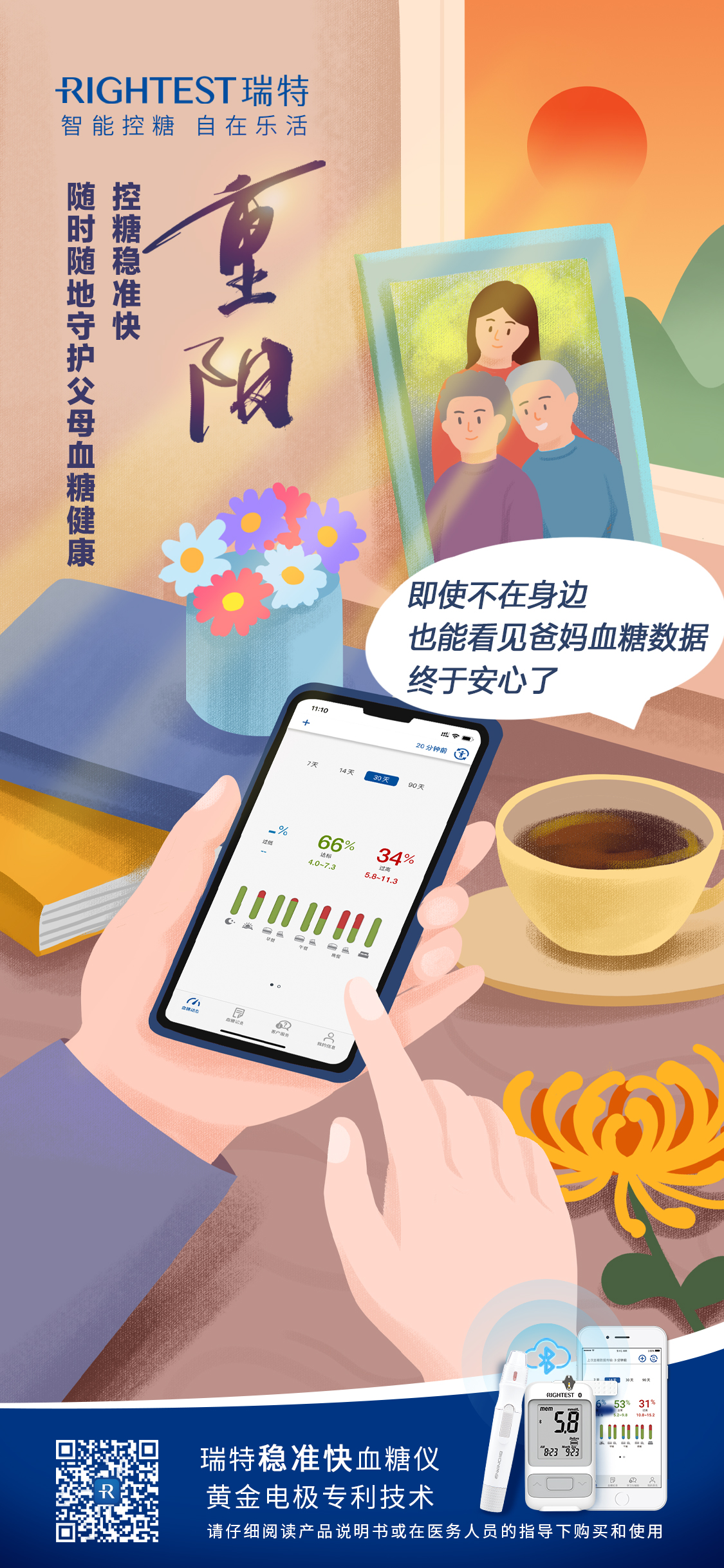 尊老、敬老、愛老、助老一直是中華民族的傳統(tǒng)美德,作為子女的能夠在力所能及的范圍內(nèi),讓父母的晚年生活更加健康,也是每個(gè)中華兒女的最大心愿。在控制血糖預(yù)防糖尿病的路上,需要我們?cè)俣帱c(diǎn)耐心、多點(diǎn)愛心、多點(diǎn)用心陪伴父母,這個(gè)重陽(yáng)節(jié)讓我們一同與瑞特血糖儀一起讓“夕陽(yáng)紅”照耀地更持久閃耀。