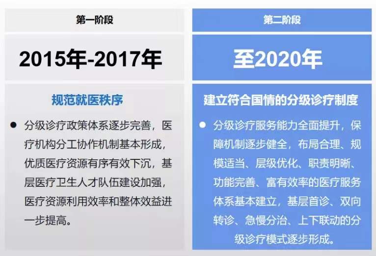 我國(guó)的醫(yī)療資源長(zhǎng)期以來(lái)集中于三級(jí)醫(yī)院,基層醫(yī)療資源匱乏,醫(yī)療資源分配不均衡的問(wèn)題日益突出。為降低龐大的醫(yī)療支出,幫助居民建立正確的就醫(yī)觀念;提高醫(yī)療效率,讓病患在就醫(yī)的時(shí)減少不必要的傷害,2015年國(guó)務(wù)院辦公廳發(fā)布了《關(guān)于推進(jìn)分級(jí)診療制度建設(shè)的指導(dǎo)意見(jiàn)》,為指導(dǎo)各地推進(jìn)分級(jí)診療制度建設(shè),圍繞總體要求、以強(qiáng)基層為重點(diǎn)完善分級(jí)診療服務(wù)體系、建立健全分級(jí)診療保障機(jī)制、組織實(shí)施等四方面提出:分兩步走的分級(jí)診療制度建設(shè)目標(biāo),到2017年,分級(jí)診療政策體系逐步完善;到2020年,基本建立符合國(guó)情的分級(jí)診療制度,并計(jì)劃在“十三五”期間基本實(shí)現(xiàn)。