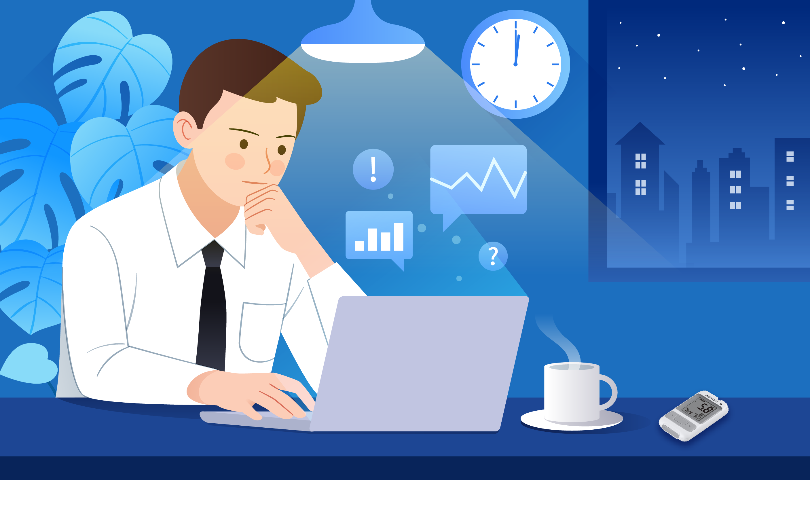 但長(zhǎng)期而往的996,無(wú)法釋放的工作壓力,各種慢性疾病已悄然潛伏在他身邊,直到有一天身體健康頻繁的發(fā)出警告信號(hào),出現(xiàn)“多飲、多食、多尿、體重卻減少”的癥狀時(shí),他才恍然意識(shí)到血糖健康為他的熬夜外賣日常買單了。