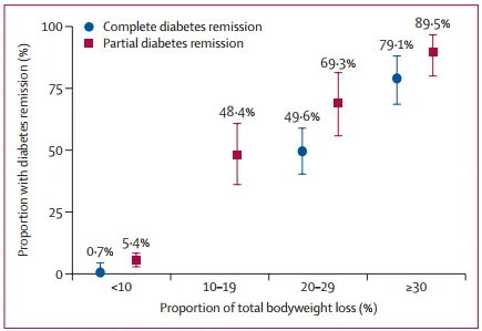 體重每減輕1%,糖尿病完全緩解的概率增加2.17%;